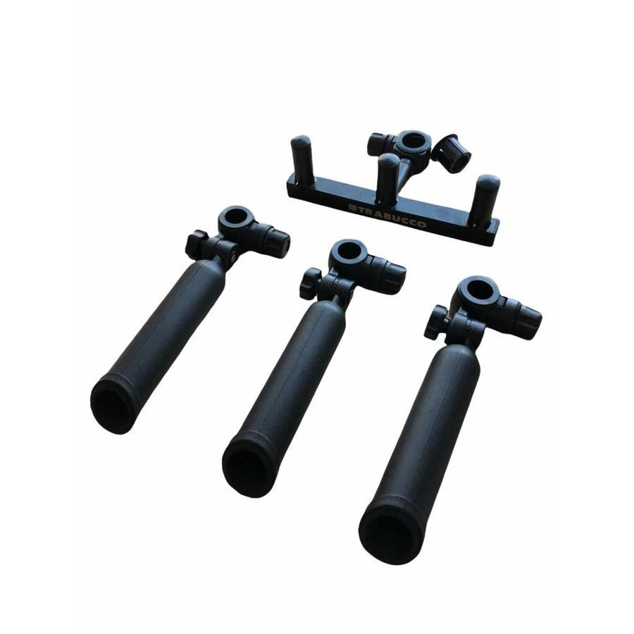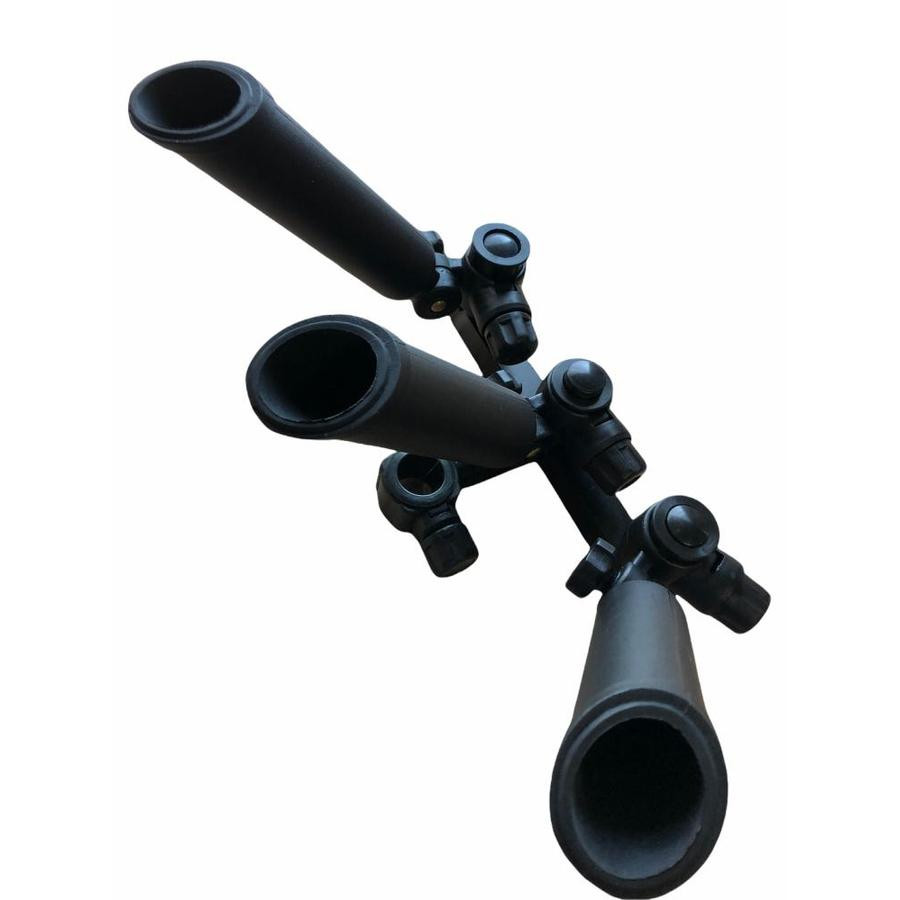 Silný, ale zároveň ľahký držiak na prúty z hliníka, ktorý slúži na súčasné uloženie 3 rybárskych prútov. Držiaky na prúty sú nastaviteľné v ľubovoľnom uhle. Gombíky upevňovacích skrutiek sú veľmi pohodlné.
