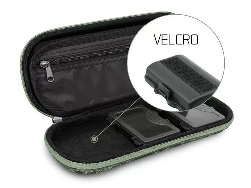 Vnútri je puzdro rozdelené na tri časti: ľavá strana je vyrobená z penového materiálu (26x10x1 cm) a má 10 žltých špendlíkov na uloženie nadväzcov, na pravej strane sú tri samostatné krabičky na kaprové príslušenstvo (10x7x2,5 cm), resp. tretia je stredová prepážka s vreckom na zips. Tu si môžete uložiť nožnice alebo iné drobnosti. Tento špičkový model je skutočne dobrý obchod!