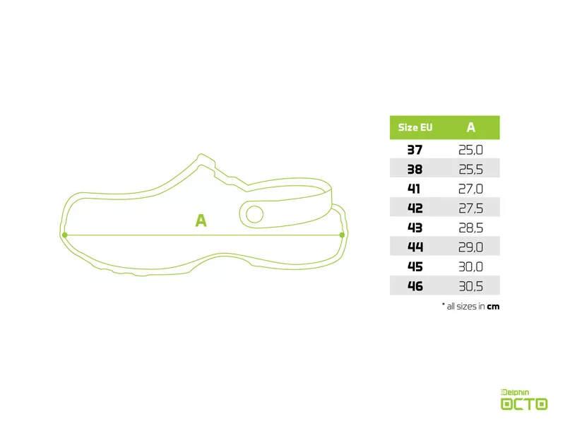 Príbeh pôvodu názvu OCTO je mimoriadne zaujímavý. Navrhli sme ho so štylizovaným tvarom chápadiel chobotnice, ktoré zabezpečujú vynikajúcu priľnavosť vo všetkých podmienkach. Chobotnica je v angličtine OCTOpus a v latinčine OCTOpoda, tieto dve slová inšpirovali dizajn a názov, ktorý sme stručne zaznamenali ako OCTO. Ďalším prepracovaným detailom sú veľké bočné otvory, ktoré slúžia predovšetkým na vetranie. Sú zámerne umiestnené nie na úrovni podrážky, ako je obvyklé, ale o niečo vyššie. Je to dôležité, pretože to pomáha zabrániť tomu, aby sa piesok alebo kamienky jednoducho dostali medzi šľapku a podrážku, najmä keď ste na brehu alebo v plytkej vode. Takže vaše nohy sa môžu cítiť maximálne chránené. Okrem toho, k vetraniu prispieva aj hustá perforácia v spodnej časti. Na jednej strane sme použili symbol písmena D z loga Delphin a na druhej strane písmeno O, ktoré je začiatočným písmenom názvu OCTO. Jemná textúra na povrchu podrážky, ktorá pripomína kožu sépie, ďalej umocňuje celkový dojem. Vďaka materiálu EVA sú šľapky extrémne ľahké, odolné a plávajú. Samozrejme, k modelu patrí aj pätný popruh, ktorý pomáha upevniť nohu, najmä pri použití na nerovnom alebo šikmom teréne.