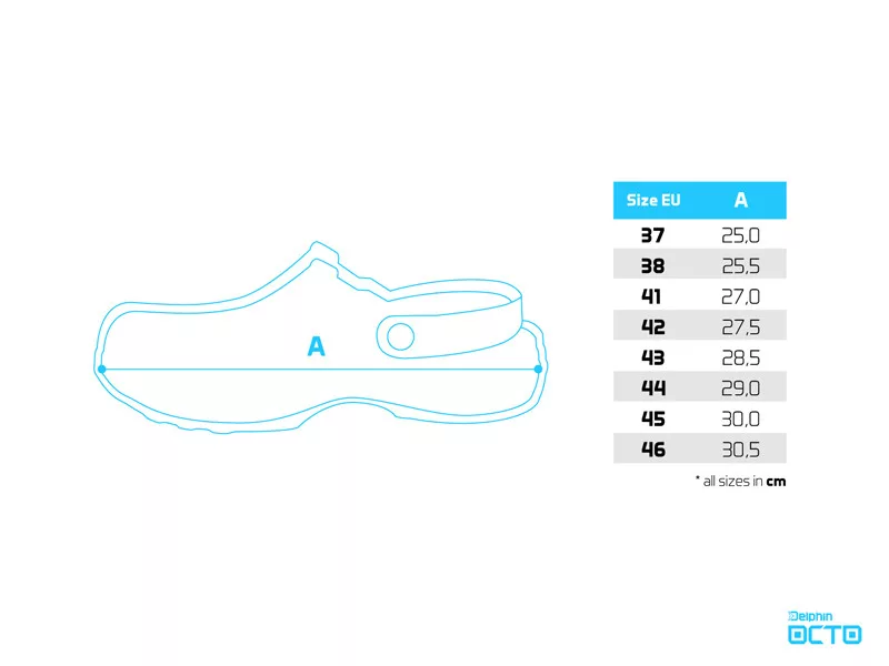 Príbeh pôvodu názvu OCTO je mimoriadne zaujímavý. Navrhli sme ho so štylizovaným tvarom chápadiel chobotnice, ktoré zaisťujú vynikajúcu priľnavosť za každých podmienok. Chobotnica je v angličtine OCTOpus a v latinčine OCTOpoda, tieto dve slová inšpirovali dizajn a pomenovanie, ktoré sme skrátene zaznamenali ako OCTO. Ďalším prepracovaným detailom sú veľké bočné otvory, ktoré slúžia predovšetkým na vetranie. Zámerne nie sú umiestnené na úrovni podrážky, ako je to zvyčajne, ale o niečo vyššie. To je dôležité, pretože to pomáha zabrániť tomu, aby sa piesok alebo kamienky jednoducho dostali medzi papuču a podrážku, najmä keď ste na pláži alebo v plytkej vode. Takže vaše nohy sa môžu cítiť maximálne chránené. Okrem toho k vetraniu prispieva aj hustá perforácia v spodnej časti. Na jednej strane sme použili symbol písmena D z loga Delphin a na druhej strane písmeno O, čo je začiatočné písmeno názvu OCTO. Jemná textúra na povrchu podrážky, ktorá pripomína kožu sépie, ďalej umocňuje celkový dojem. Vďaka materiálu EVA sú papuče mimoriadne ľahké, odolné a plávajú. Samozrejme, model obsahuje aj pätový pásik, ktorý pomáha fixovať nohu, najmä pri použití na nerovnom alebo šikmom teréne.