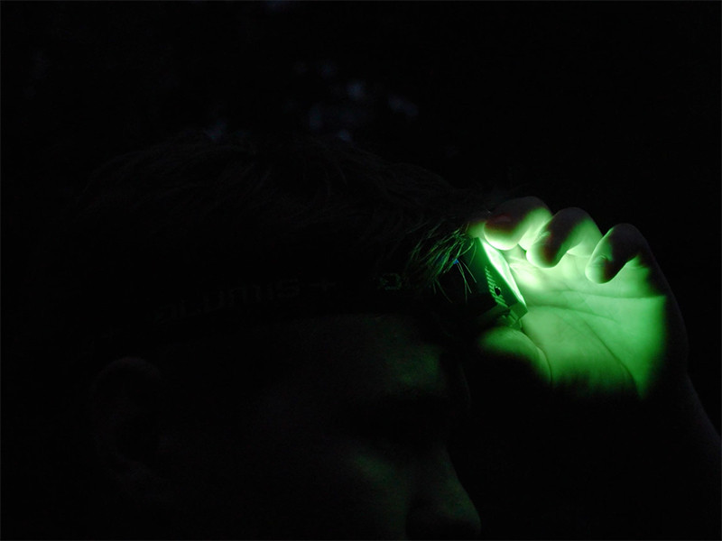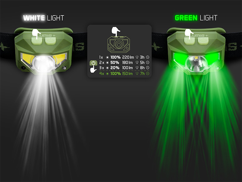 Výkon 3 watty a svietivosť 220 lúmenov čelovky poskytujú dostatočné osvetlenie aj v úplnej tme. Dve rôzne LED diódy (biela a zelená) umožňujú prispôsobiť svetelný zdroj prostrediu a situácii. Biele svetlo je nastaviteľné v troch úrovniach – 100%, 50% a 20% – takže si môžete zvoliť optimálnu intenzitu svetla v závislosti od situácie. Režim zeleného svetla je obzvlášť užitočný pre rybárov, pretože neruší ryby a nepriťahuje hmyz, takže letné noci na brehu môžu prebehnúť bez rušenia.