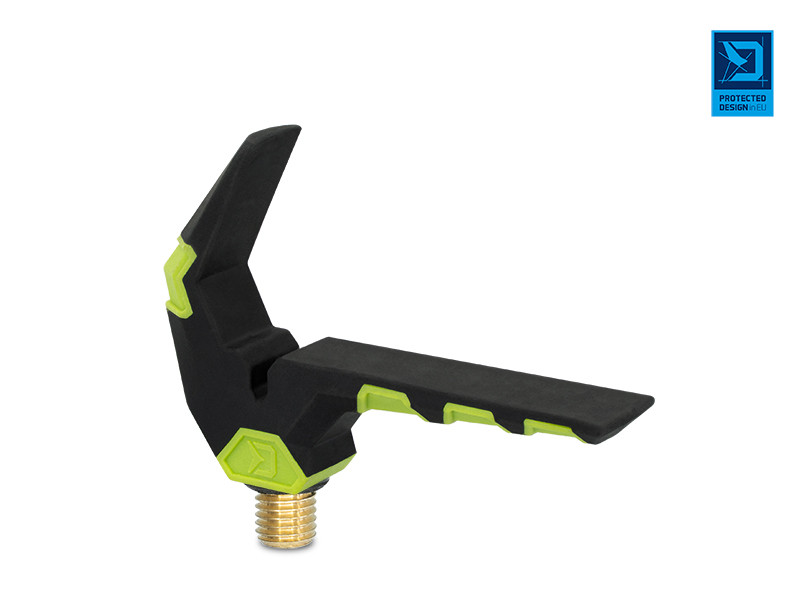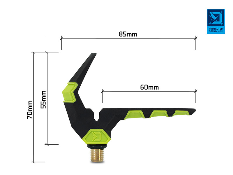 Má tiež drážku na zníženie trenia vlasca a pre lepšie vedenie vlasca. Jeho povrch je potiahnutý gumovým materiálom, ktorý chráni prúty pred poškodením. Tento držiak na prút je vyrobený z pevných materiálov, takže sa ľahko nepoškodí ani nepoškriabe. Má univerzálny závit, ktorý je kompatibilný so všetkými štandardnými ramenami, držiakmi a vidličkami. Gumová časť na stopke držiaka zabraňuje jeho otáčaniu. Celková výška je 55 mm, dĺžka je 85 mm.