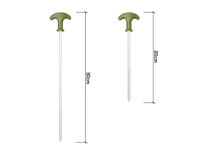 Dĺžka: 20 cm, počet kusov: 5 ks. Horná časť je zo zeleného plastu, protišmyková, špička má štvorstranný vŕtací dizajn. Prepravná taška: Vyrobená z odolného materiálu pre bezpečné uloženie kolíkov.