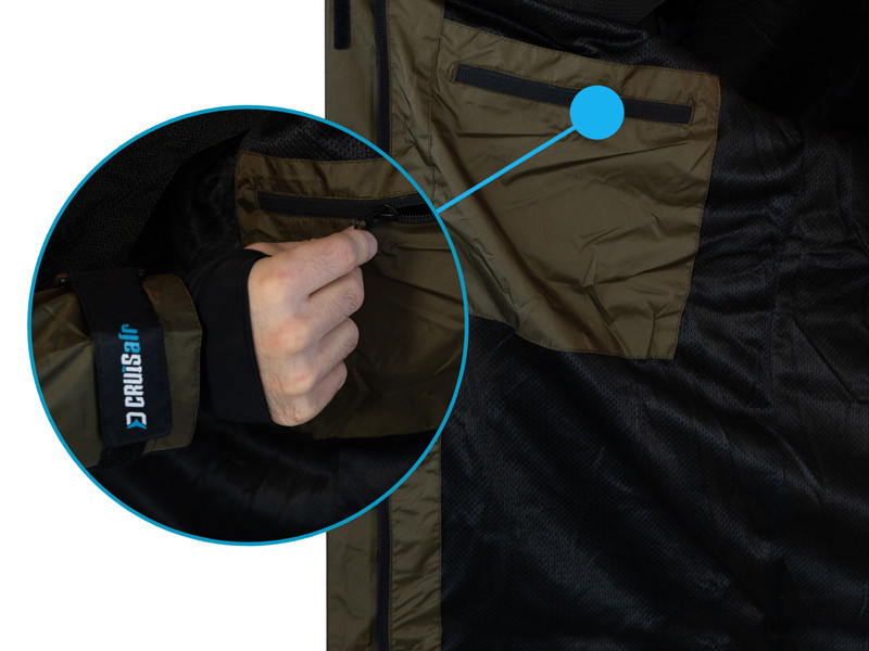 Vnútorná strana bundy je vybavená sieťovanou tkaninou, ktorá je nielen príjemná na dotyk, ale tiež zaisťuje, že koža neprichádza do priameho kontaktu s vonkajším materiálom. Tým sa výrazne zvyšuje komfort nosenia, najmä pri dlhších rybárskych výpravách. Vnútorné vrecko na zips ponúka praktické riešenie pre bezpečné uloženie dôležitých dokumentov alebo menších cenností. Na vonkajšej strane bundy sú dve vrecká s vodotesným zipsom, ktoré spoľahlivo chránia obsah vreciek pred vniknutím vody, čo je pri rybárskej výprave nevyhnutné.