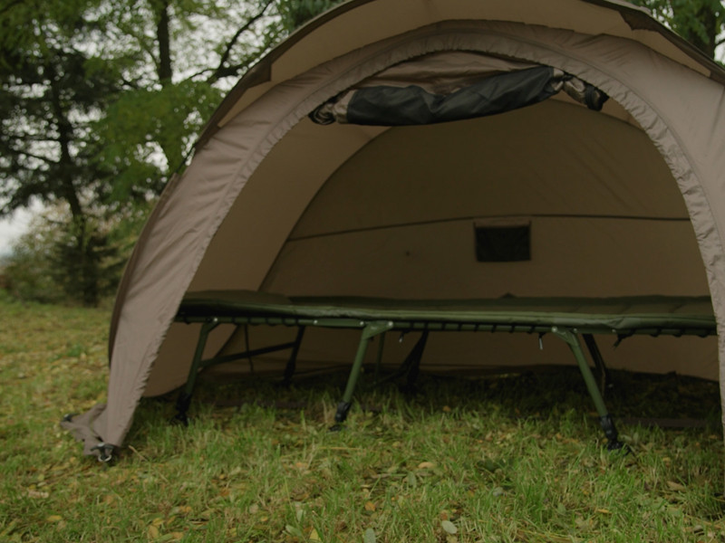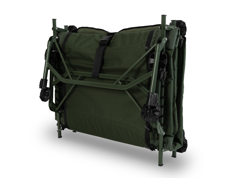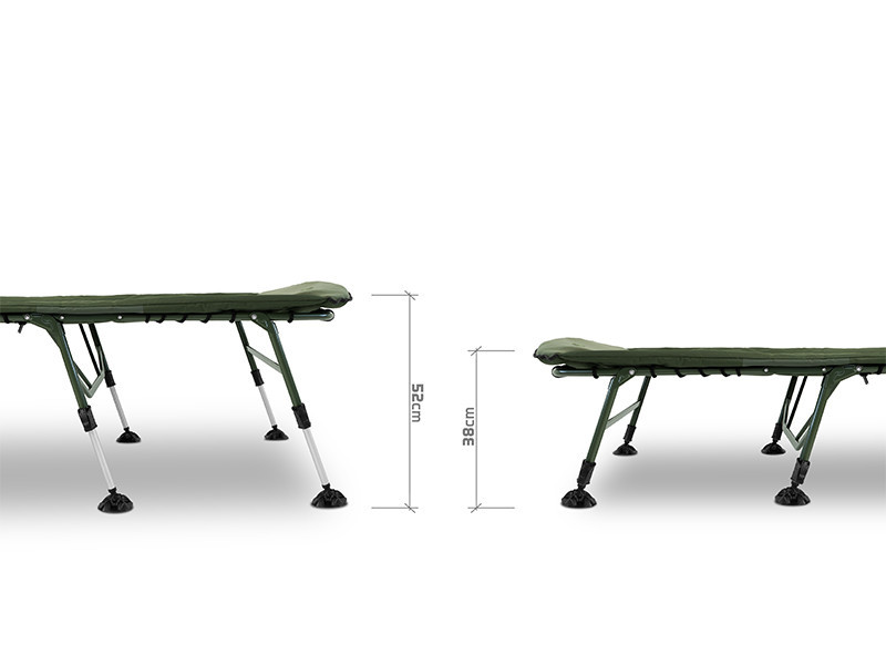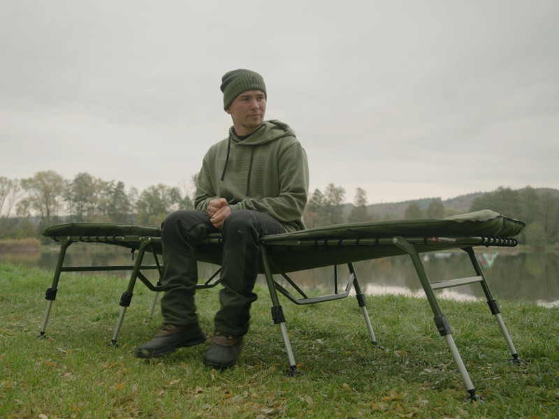 Rybárske lehátko je postavené na silnej, vysoko zaťažiteľnej kovovej konštrukcii, ktorá odoláva intenzívnemu používaniu, no napriek tomu je ľahká a jednoducho prenosná. Mechanizmus uchytenia nôh v hlavovej časti zabraňuje nechcenému zloženiu, čo umožňuje bezpečné a rýchle rozloženie. Celý povrch matraca je potiahnutý mäkkým fleecom, ktorý je príjemný na dotyk a poskytuje teplý pocit počas chladných nocí. Okraj chráni odolný, olivovozelený materiál 600D, ktorý je odolný voči oderu a zaručuje dlhú životnosť.