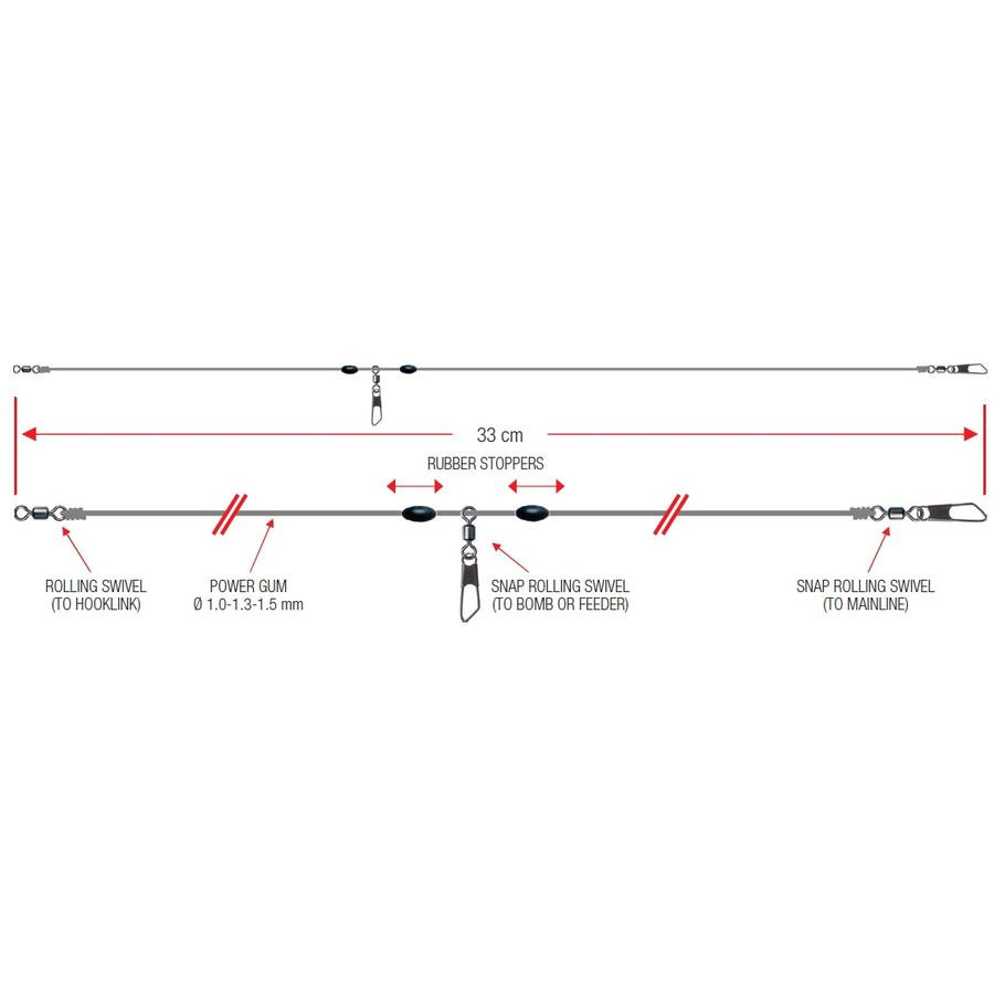 Na jednom konci montáže (náväzec) sa nachádza obratlík, na druhom konci (hlavný vlasec) karabínka s obratlíkom. Pozícia centrálnej karabínky s obratlíkom (košík) sa dá nastaviť pomocou dvoch gumových zarážok. Balenie obsahuje dve montáže.