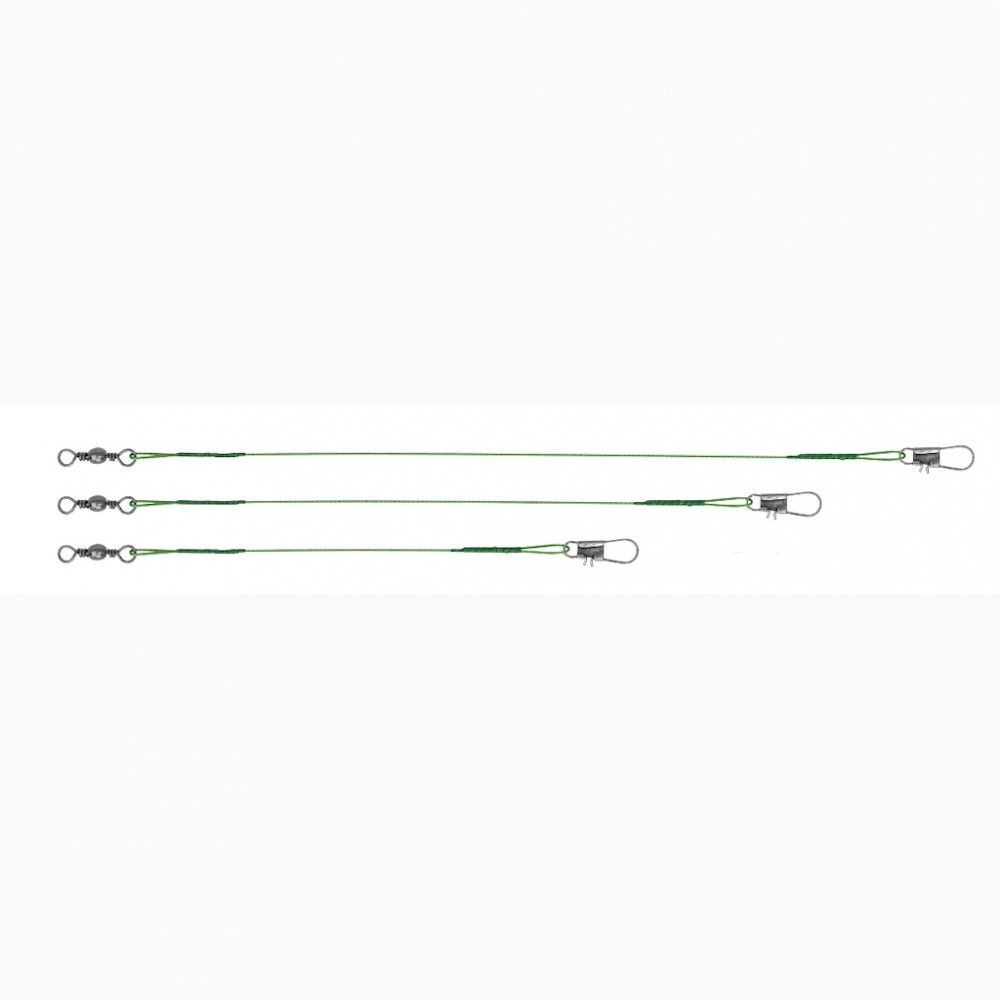 Dôležitá výbava na jesenný lov šťúk, ktorá zabráni dravým rybám prehryznúť vlasec. Nadväzec spletený zo siedmich prameňov nehrdzavejúcej ocele, so zelenou povrchovou úpravou, vysokou nosnosťou a dlhou životnosťou, ktorý výrobca vybavil obratlíkom a karabínkou odolnými voči výpadom kapitálnych rýb. Odporúčame ho predovšetkým na lov na živú rybku, ale dá sa použiť aj na prívlač. V balení je 10 kusov 15 cm, 10 kusov 25 cm a 30 kusov 20 cm oceľových nadväzcov, ktoré všetky majú nosnosť 14 kilogramov.