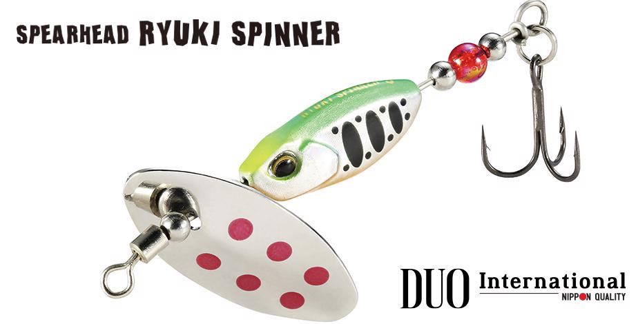 DUO Spearhead Ryuki Spinnery sú dostupné v dvoch hmotnostiach: 3.5g a 5g, so zlatými alebo striebornými čepeľami. Sú vybavené vysoko kvalitným trojháčikom DUO Spearhead Ryuki, ktorý nájdete na všetkých wobblerech Ryuki. Prémiový spinner, 100% Made in Japan.