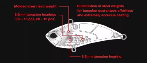 Fixné oceľové guľôčky (6,5 mm x 1) a voľne pohyblivé hrkálky (3,0 mm x 12) boli nahradené volfrámovými guľôčkami rovnakej veľkosti. Okrem toho bola k hlave nástrahy pridaná tvarovaná fixná záťaž, čím sa celková hmotnosť zvýšila o 5 g oproti bežnému modelu.