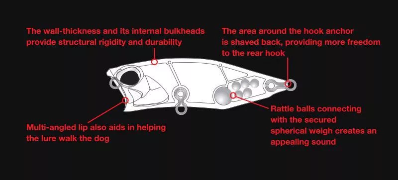 Zvukové komory v Realis Popper 64 sú pokročilejšie ako v iných JDM popperoch. Dokážu generovať zvuk rovnomerne a z viacerých smerov, na rozdiel od mnohých povrchových nástrah, ktoré dokážu maximalizovať akustiku len jedným smerom.
