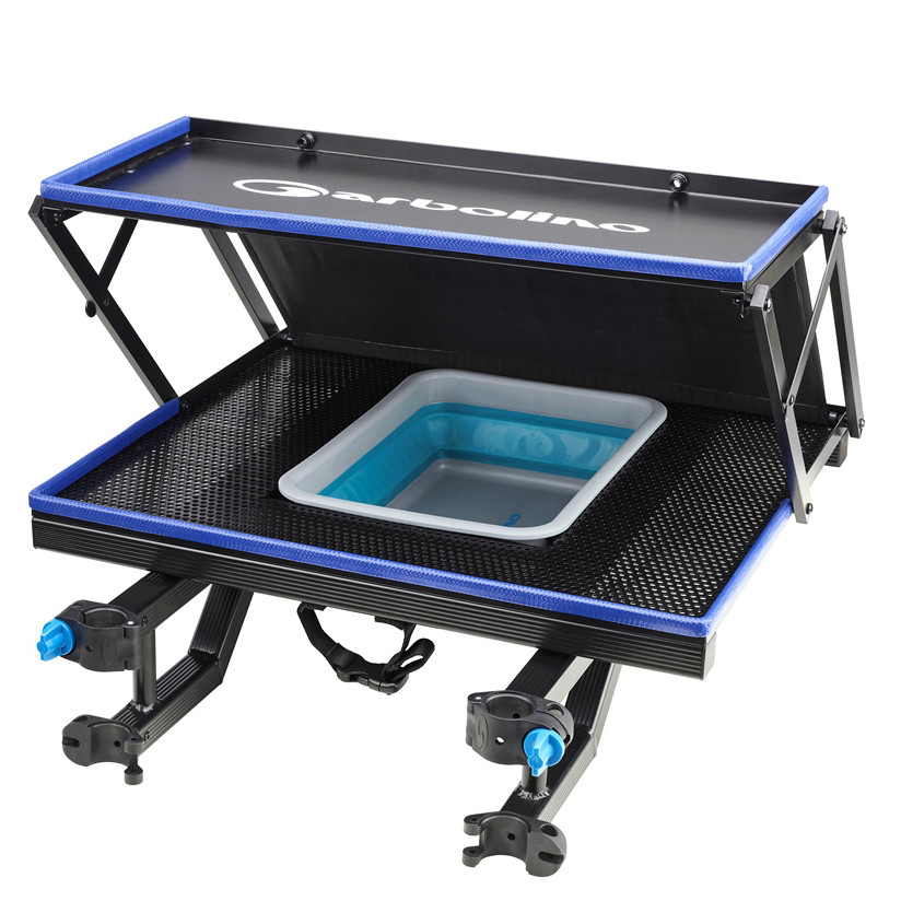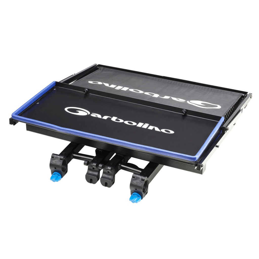 Model s odnímateľným otvorom a perforovanými hliníkovými doskami umožňuje ľahký prístup k príslušenstvu. Horný podnos je skladací, aby optimalizoval skladovanie najdôležitejšieho vybavenia, zatiaľ čo zabudovateľné prvky umožňujú pridanie odnímateľných držiakov, čím poskytujú ešte väčšiu všestrannosť. Tento podnos, kompatibilný so stanicami typu D25, D30 a D36, je inováciou Garbolino, navrhnutou pre pretekárov.