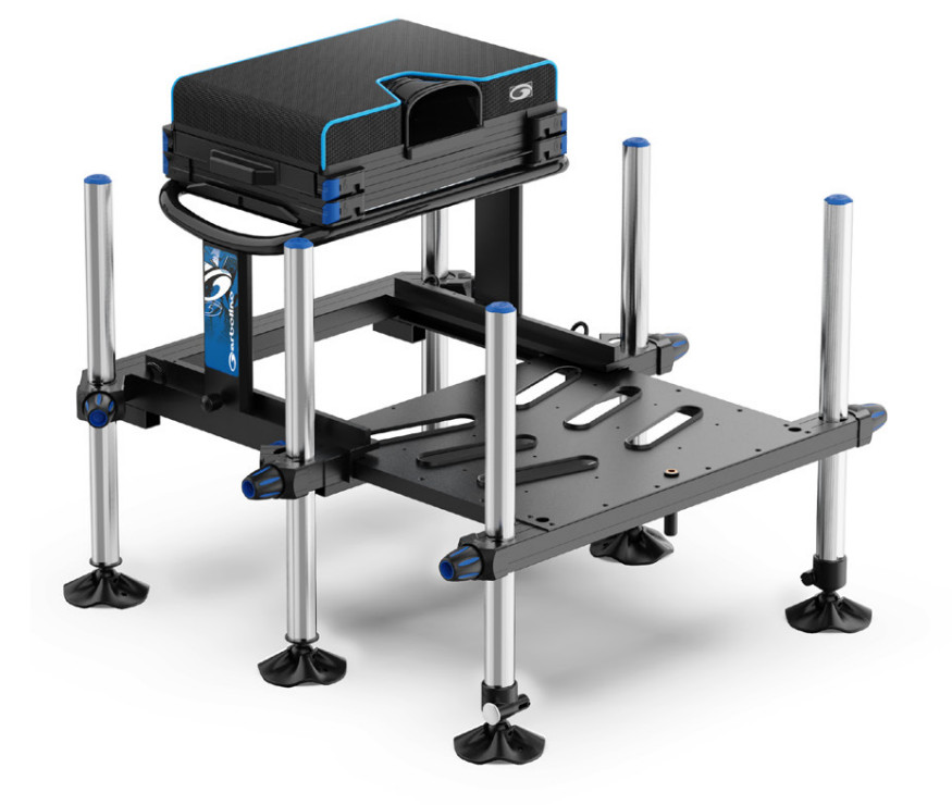 Rámová konštrukcia v tvare „T“ je podopretá 6 hliníkovými nohami D36, vrátane 2 Pinlock nôh a 4 pevných nôh, čím zabezpečuje optimálnu stabilitu pri love s dlhými udicami. Táto konfigurácia kombinuje ľahkosť a robustnosť, ktoré sú základnými vlastnosťami na brehu vody.