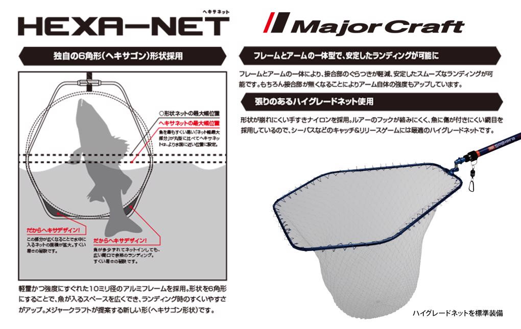 Kompaktná verzia podberáku Major Craft HexaNet. Vďaka použitiu pogumovanej siete minimálne poškriabe telo ryby, aj keď je ryba živá. Široký šesťhranný tvar tvorí rám počas podberania. Odporúča sa pre ľahký slanovodný rybolov, ako napríklad lov čierneho chňapáča a v oblastiach s tvrdými skalami.