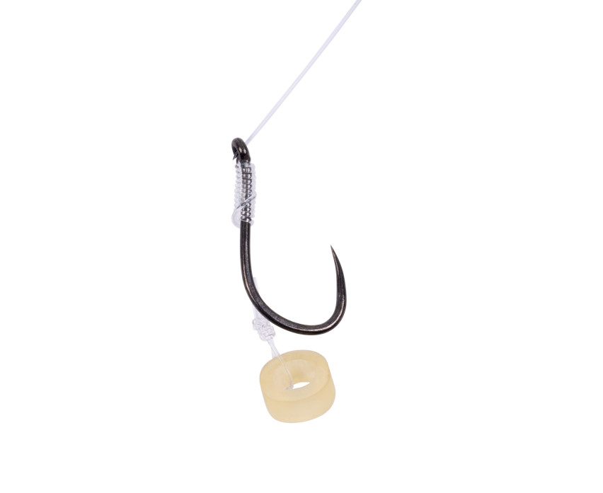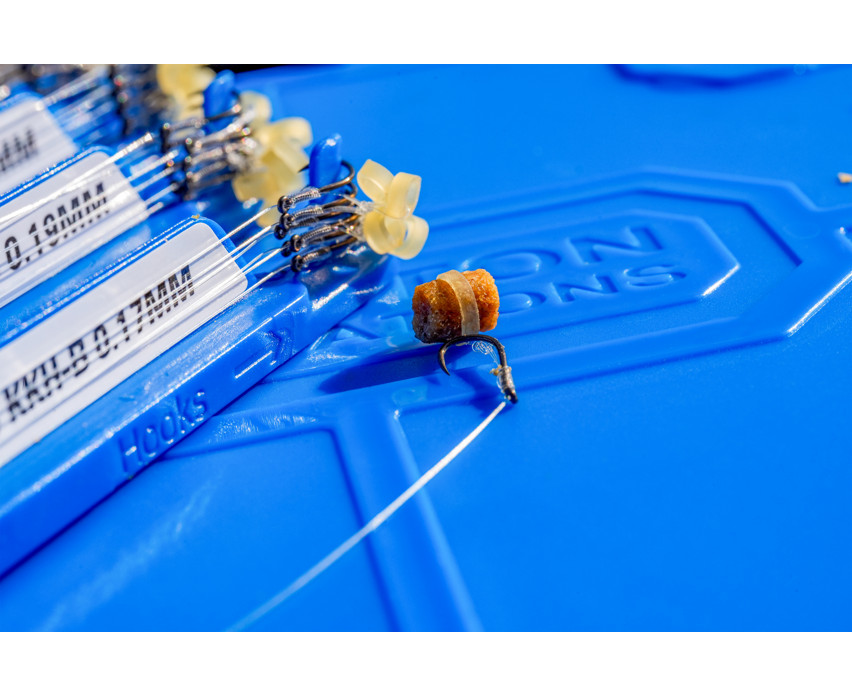 Mimoriadne silné a spoľahlivé háčiky boli pripevnené na konci nášho Reflo Power vlasca. Háčiky sme pripevnili bezuzlovým viazaním na predviazané nadväzce KKH-B Mag umiestnené na držiakoch nadväzcov a na nastraženie sme použili odolný silikónový krúžok. Je to vynikajúca voľba, ak chcete nastražiť tvrdé pelety rôznych veľkostí.