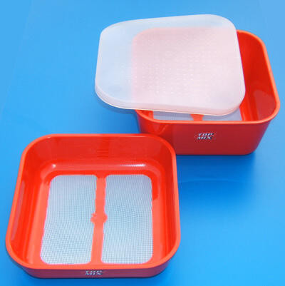 Kvalitné krabičky na nástrahy s dnom zo sitoviny o rozmere 16x16 cm, s vekom, na skladovanie kostných červov a dážďoviek. Na vnútornej stene krabičiek je objemová stupnica v litroch a pintách. To je potrebné pri kontrole limitov na súťažiach. V krabičkách sa dajú nástrahy bezpečne skladovať aj v letných horúčavách, nemôžu sa udusiť.